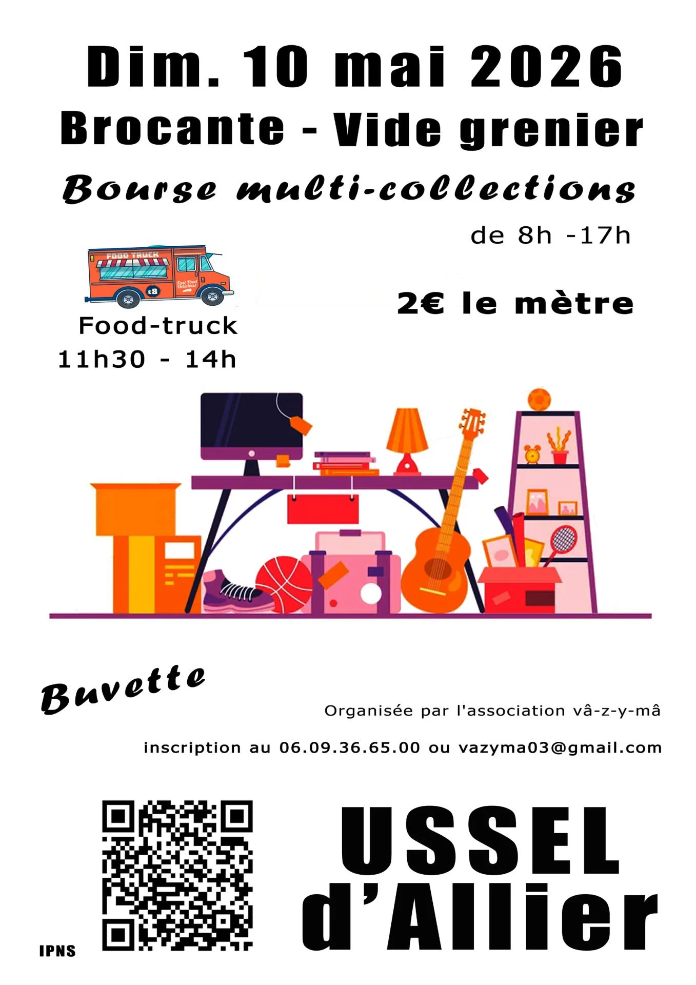 L’association vâ-z-y-mâ organise le dimanche 10 mai sa brocante, vide grenier, bourse aux collections de 7h à 17h.